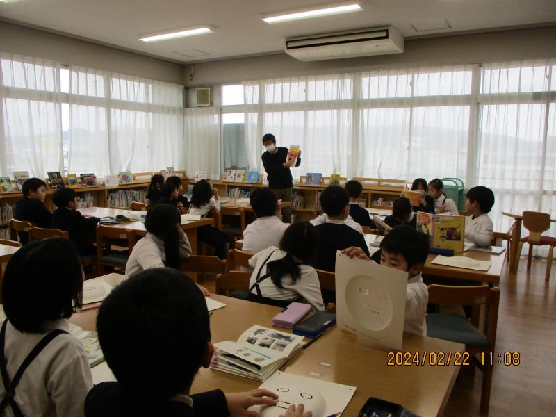 2年生の図工では、お面を作っていました。デザインを決めるため図書館で本を参考にしていました。