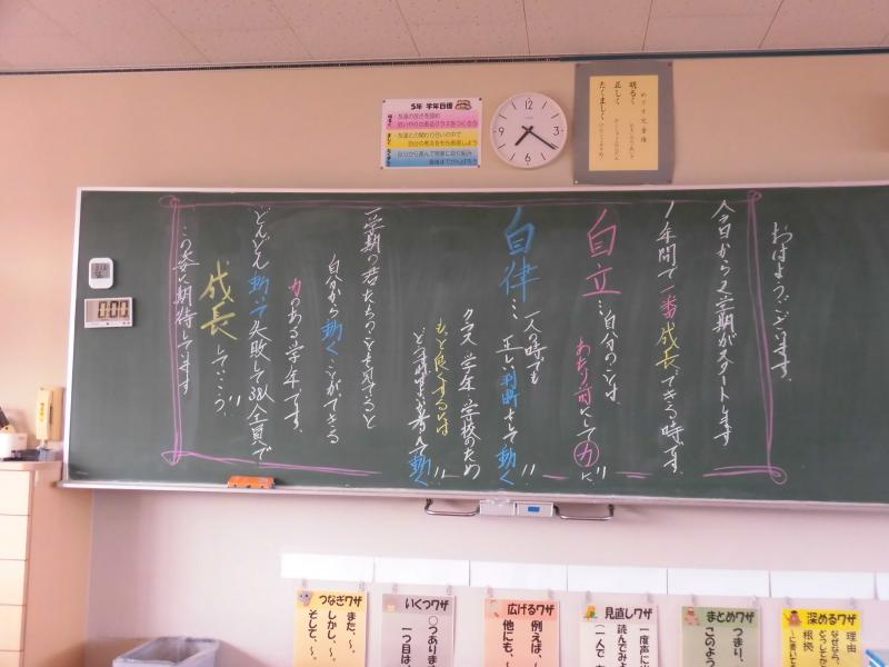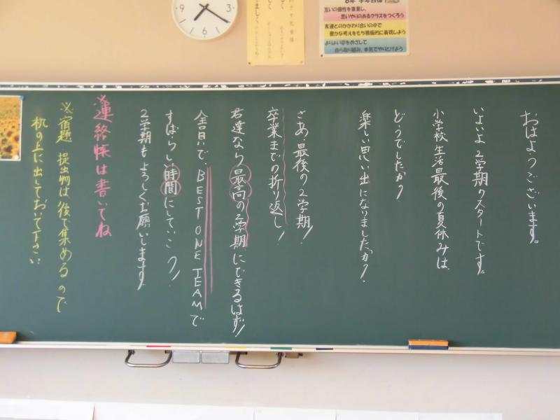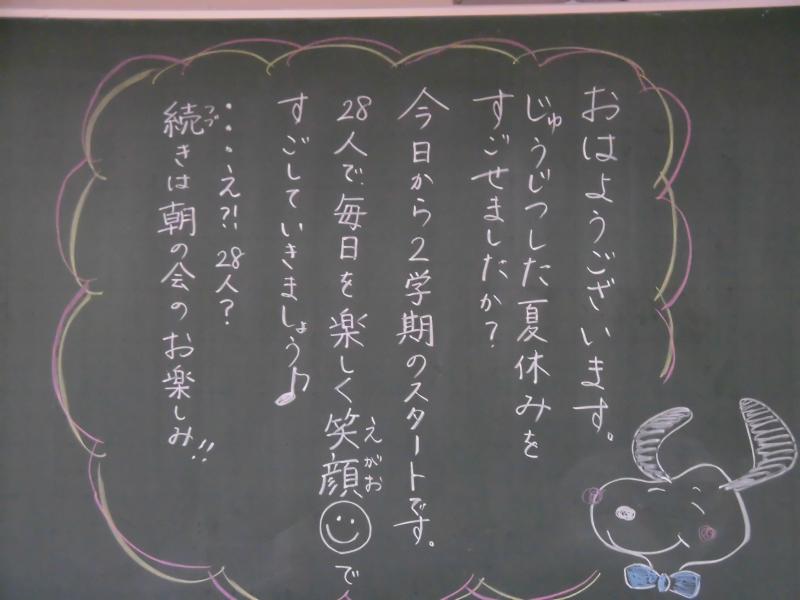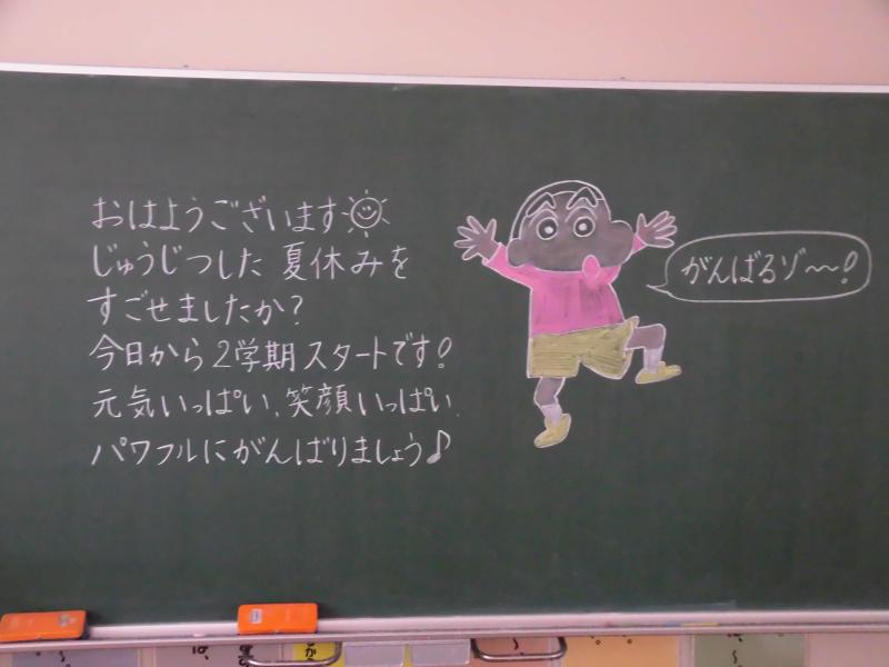 2学期がスタートする今朝の各クラスの黒板です。担任の熱い思いが伝わってきます。いろいろ工夫されています。黒板アート級のワンピース、ピカチュウ、バイキンマン、しんちゃんなど、世代がわかりますね。私はタイガーマスク!