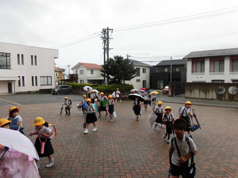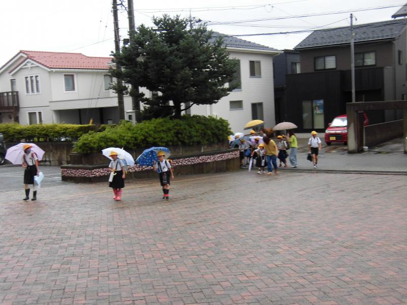 朝の玄関です。元気に登校です。傘を持ってくる子が多くいました。天気予報はあらるかな?
