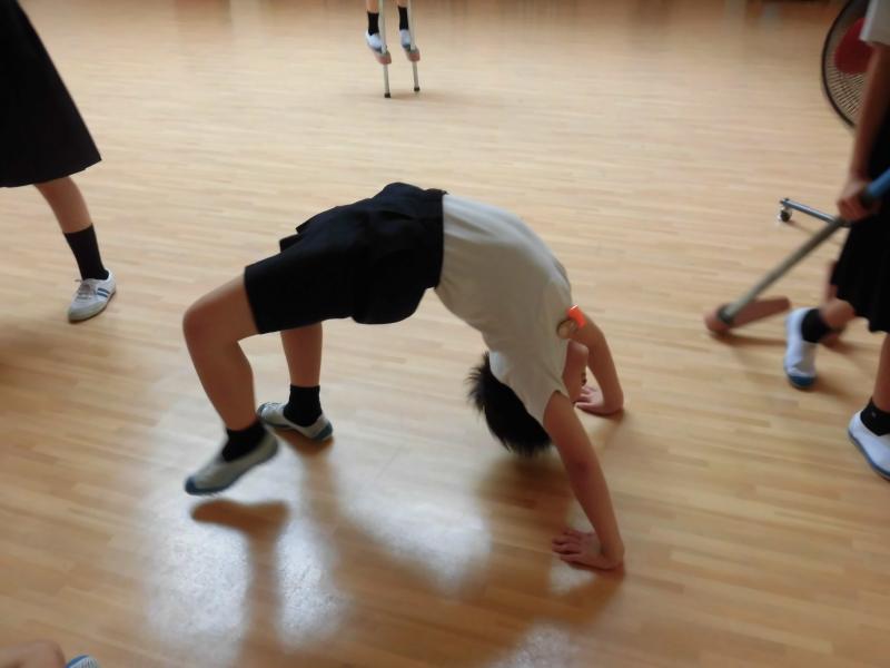 体育館にお邪魔しました。高学年は運動会の組み体操に向けて少しずつ体を慣らしています。