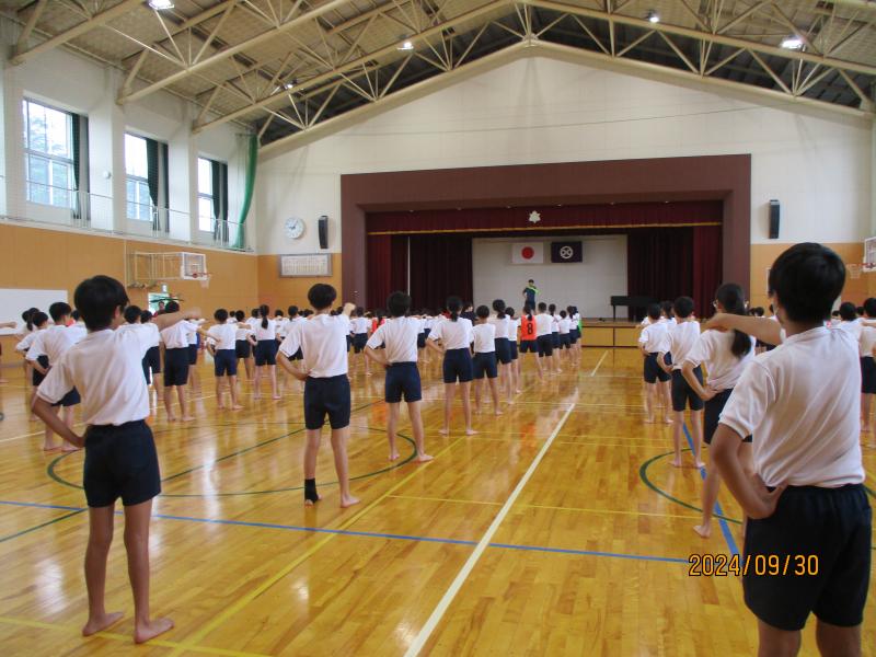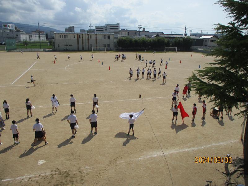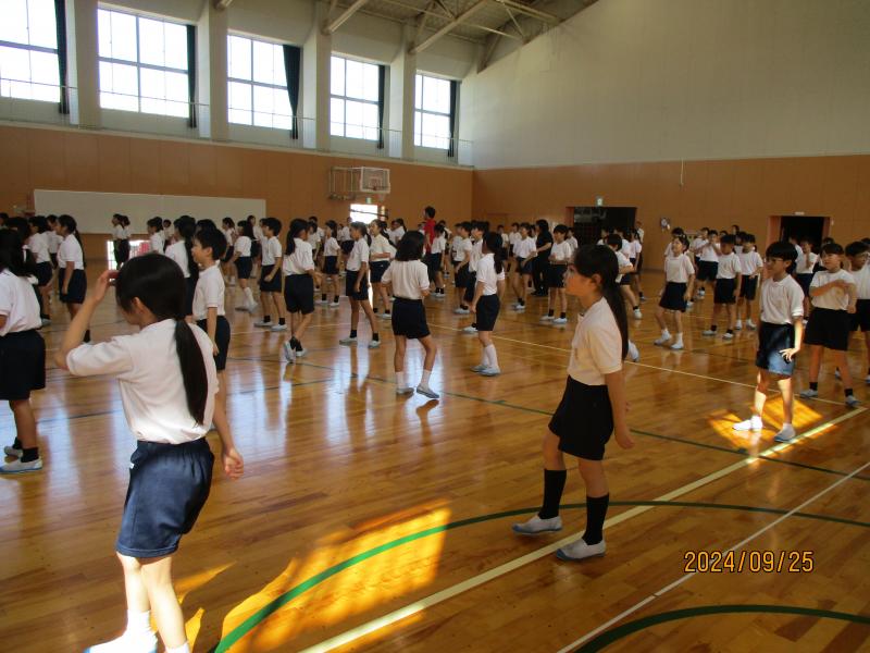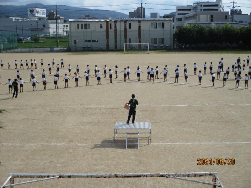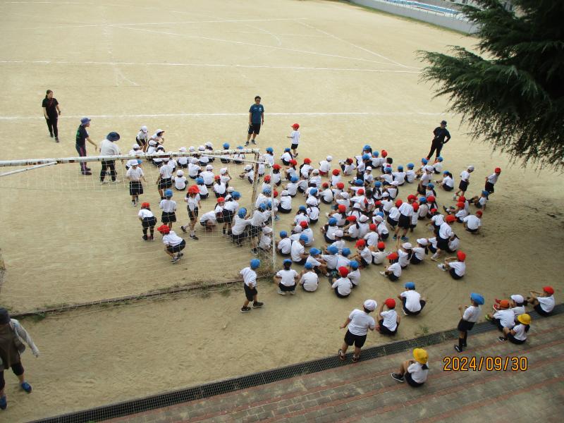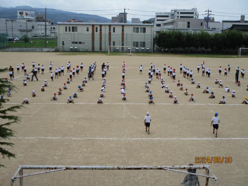 1年生と2年生は、運動場に出ての初めての練習です。自分の位置を確認して練習をしていました。