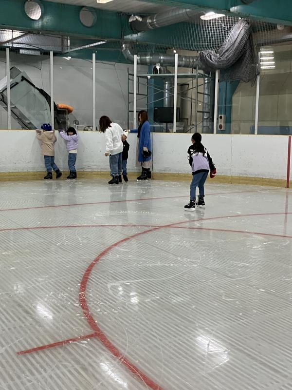親子スケート教室を開催しました。はじめは、みなさんリンクの寒さやリンクってこんなに滑るの?って驚いていました。写真の通り、最初は一列に並び、みなさんでリンクの手すりの掃除をしっかりして頂きました。
