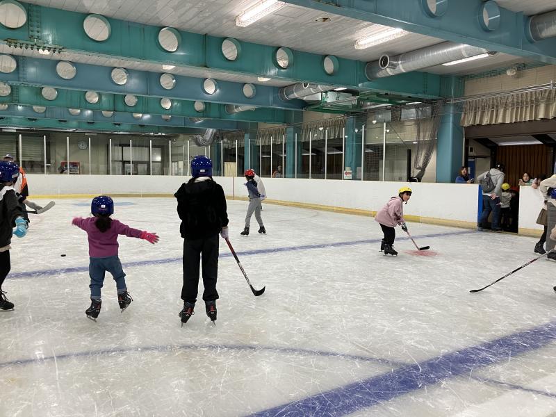 後半の15分間はアイスホッケー連盟に皆さんに教えていただきアイスホッケーも体験しました。