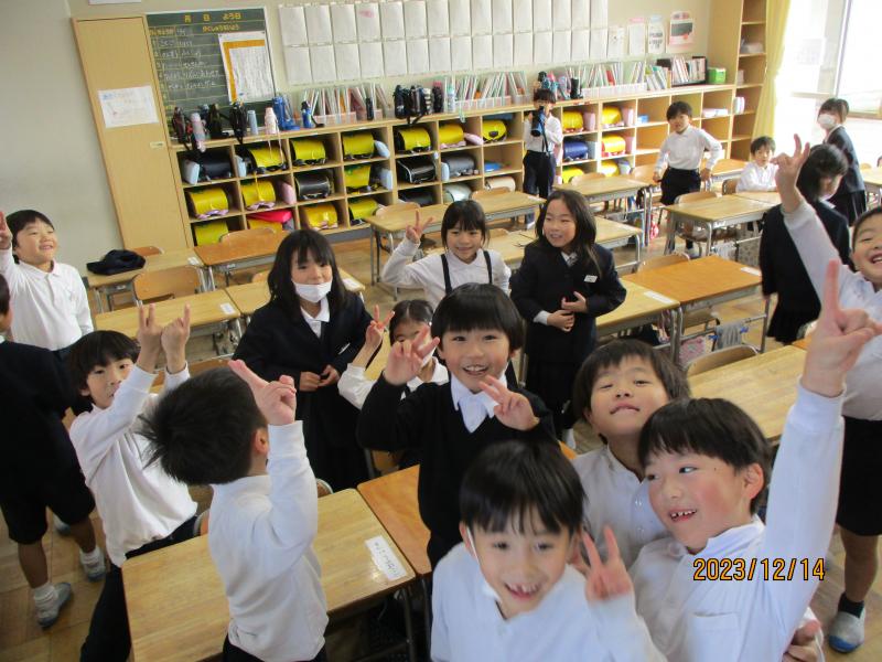 最後は元気な1年2組です。掃除の終わりに行くと「雑巾がけ68回した」「私は32回」「俺なんて100回」と一生懸命に掃除をした報告をしてくれました。そしてピースサイン。
