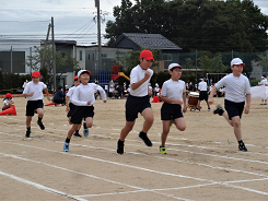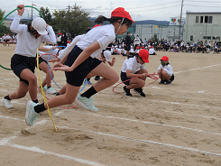 せまる本番に向け、赤・白組2組ずつが精一杯の力を出して、トラックをかけまわりました。優勝のカギを握るのが、バトンパス。繰り返し練習をしているチームがよく見られました。
