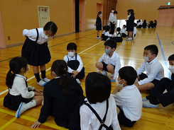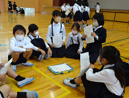 今日2限目に1・2年生が体育館に集まり「遠足よろしくの会」を行いました。17日の校外学習では、1・2年生合同グループで動物園をまわります。今日はリーダーの2年生を中心に自己紹介やまわり方などの説明がありました。やさしく教える2年生の姿は、立派なお兄さんお姉さんそのものでした。