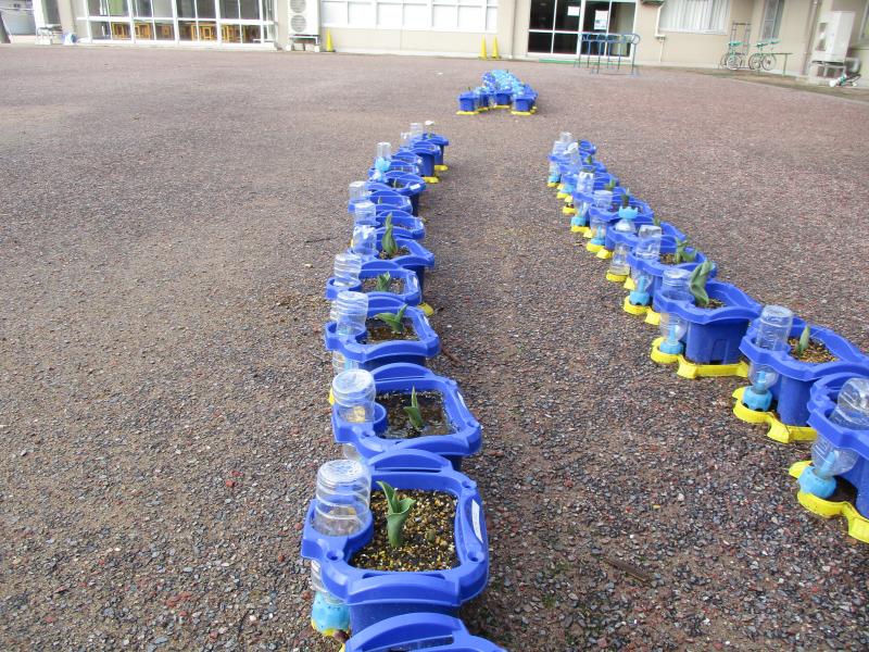 1年生が植えているチューリップ芽がぐーんと伸びてきました。春の訪れを感じます。休み時間の様子です。