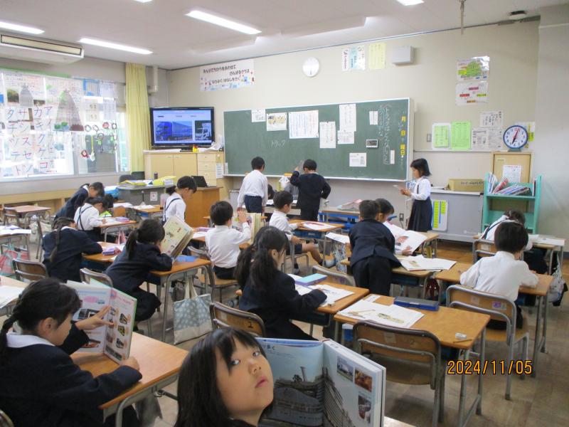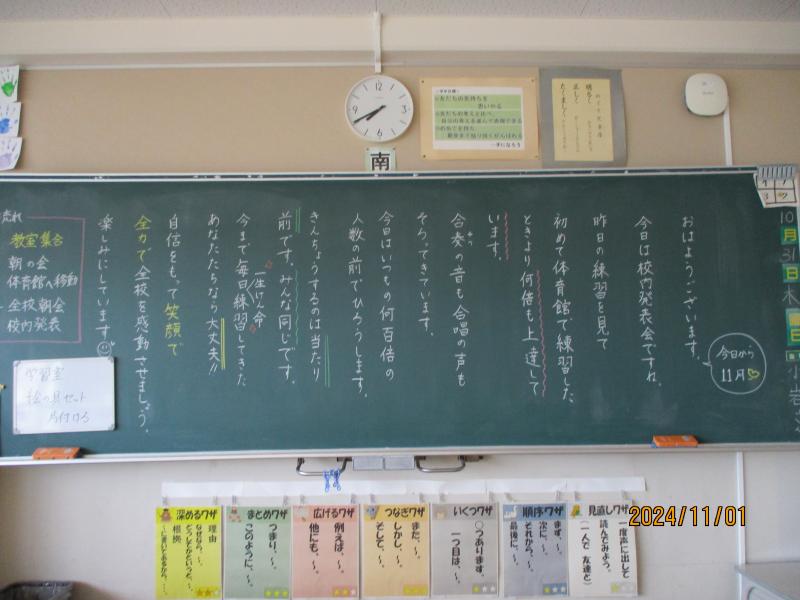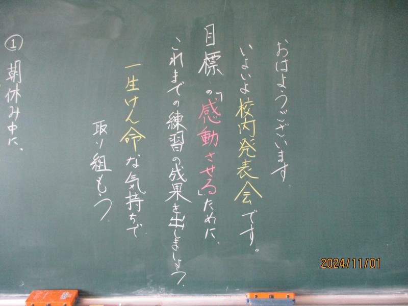 今日の全校集会後に全校の前で初めての発表です。4年1組・2組の朝の黒板です。緊張もよい経験です。本番に向けてしっかり取り組んで欲しいと思います。