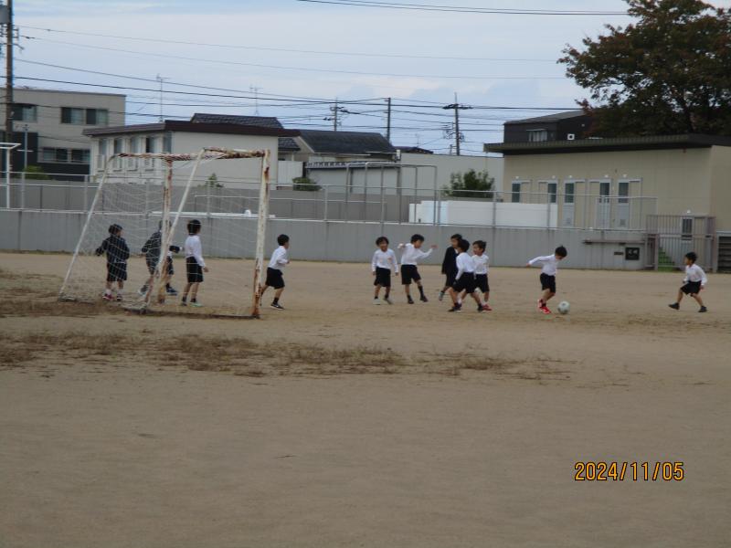 昨日の暖かい日から、急変し寒い朝になりました。しかし、元気にサッカーで遊ぶ姿がありました。