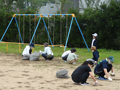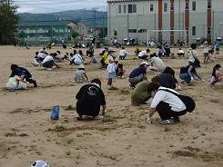 雨がりの早朝、グランドにはたくさんのたちのっ子、保護者の皆様が集まってくださいました。7時から始まった清掃作業。たった45分間でしたが、グランド一面に生えていた草があっという間になくなりました。カラータイルや学校の周りも見違えるほどきれいになりました。