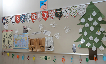 ALTのシェボーン先生は季節に合わせて外国語の掲示板を飾ってくれています。12月はクリスマス。ツリーには職員が各々「クリスマスに欲しいもの」を裏に書いたボールの飾りがつけられています。あゆみ渡しの際には東階段3・4階踊り場の掲示板へぜひお立ち寄り下さい。