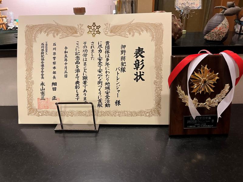 日頃、地域の皆様のおかげで、子ども達が安全に登下校することができ感謝申し上げます。このたび、長年の功績が評価され、押野防犯パトレンジャー様が表彰されました。隊長の西村様をはじめ、皆様ありがとうございました。