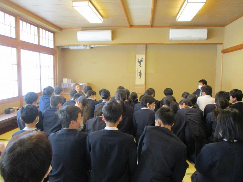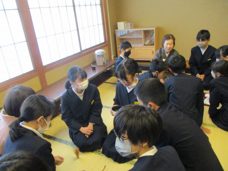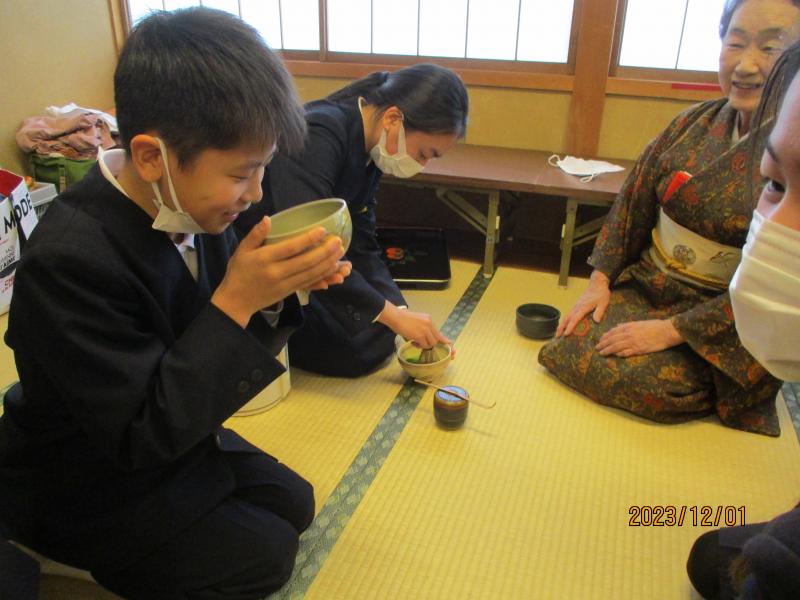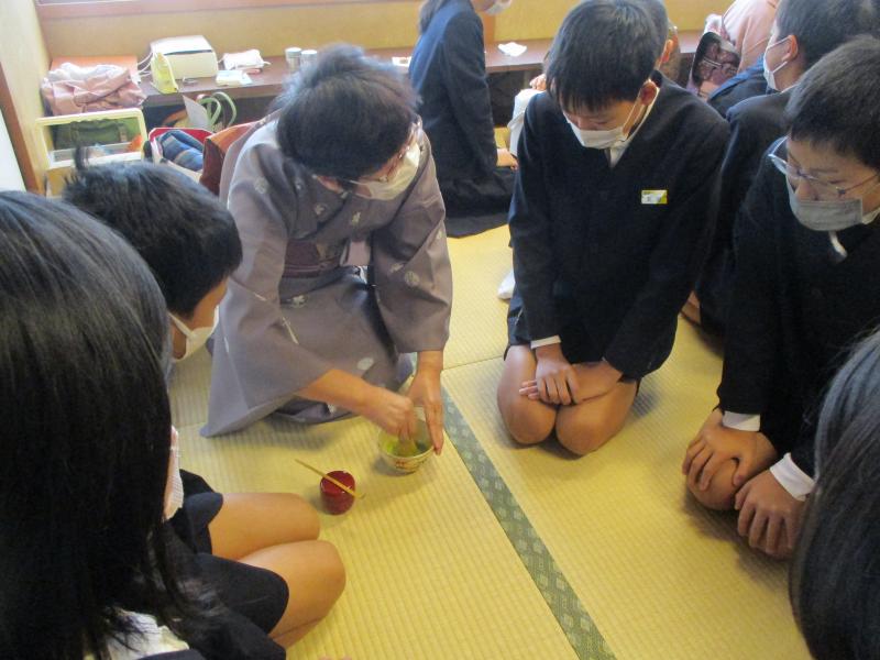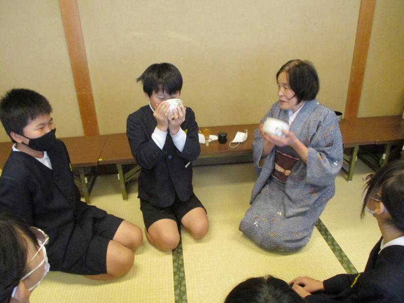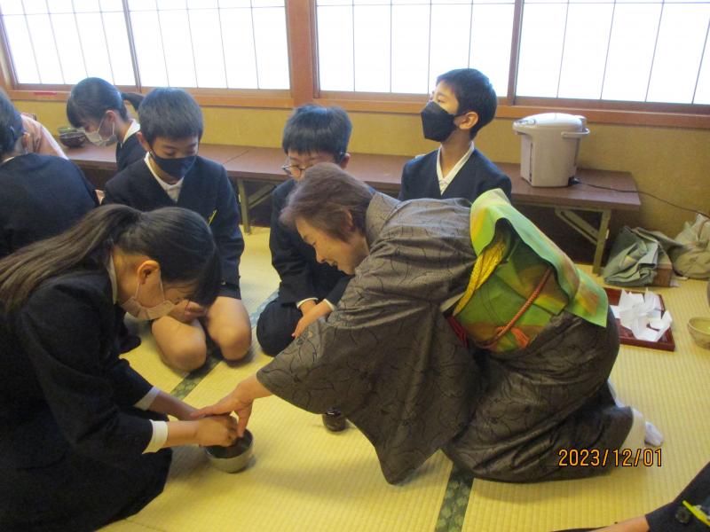6年生は,野々市市茶道協会のご協力により、茶道を体験させて頂きました。しっかりを抹茶を点てました。茶杓、茶せんを使い1人1人がお茶を点ててお茶を愉しみました。