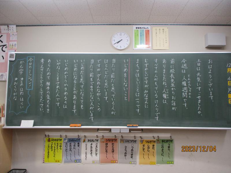 朝、校内をまわっていたら、あるクラスの黒板に、メッセージがありました。今週から始まる「人権週間」に関連したメッセージでした。いじめは悪いことだと、多くの子ども達は理解していますが、何気ない一言や行動で,友だちが嫌な気持ちになることがあります。「相手の気持ちを考え,行動する」ことが大切ですね。私自身も寛容な心を大切したいと考えています。