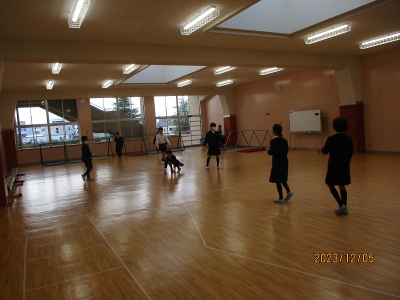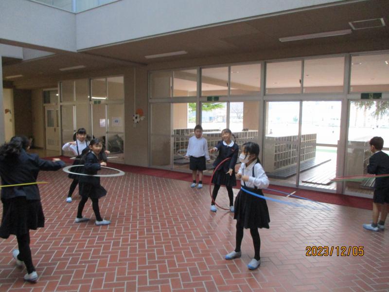 フープをする2年生やプレールームで鬼ごっこをする4年生です。