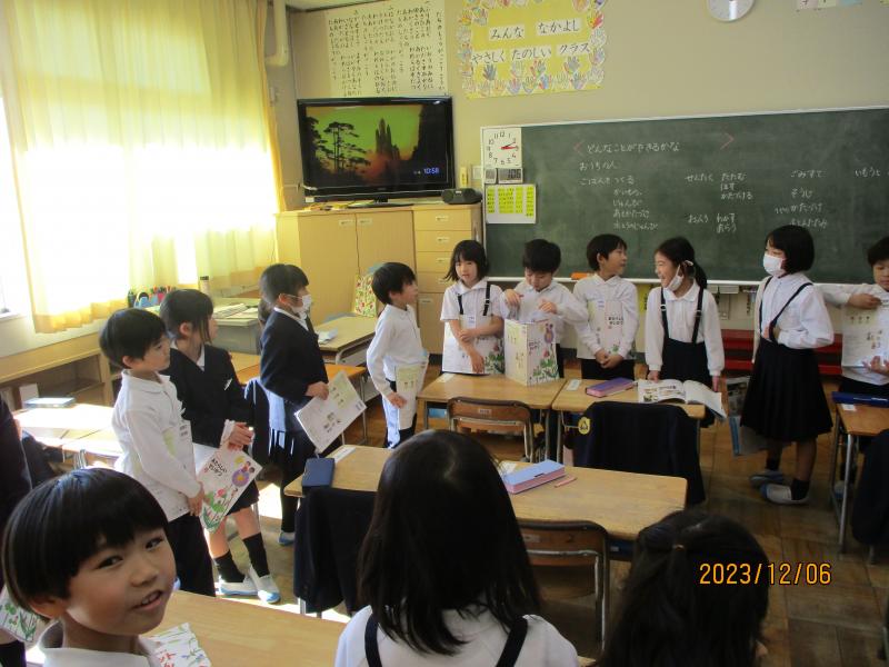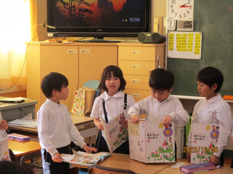 1年生の生活科では、冬休みの家でのお手伝いについて、丸くなり話しやすい環境を作り発表していました。「家の拭き掃除を全部する」と大きく発表する子もいました。
