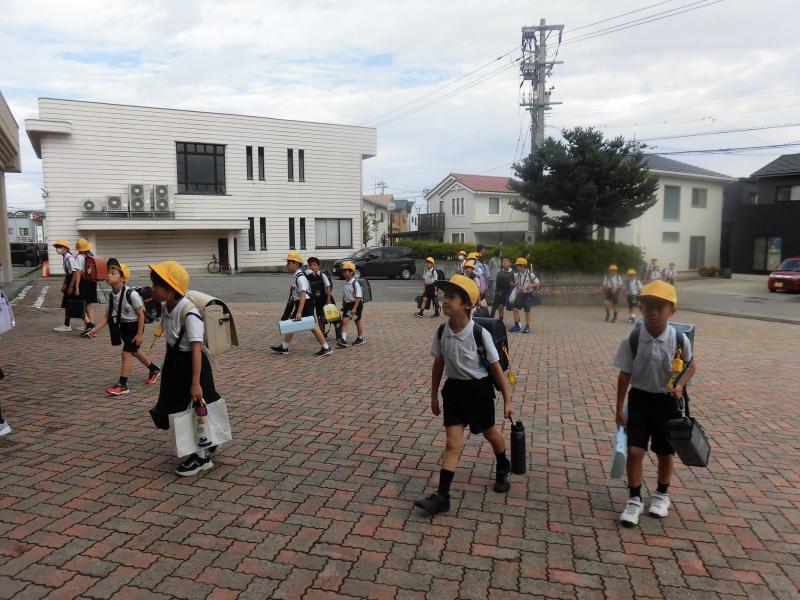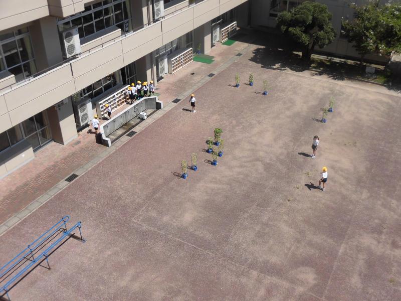 1年1組が秋みつけから戻ってきました。4階から見ると、こんなに小さく見えます。