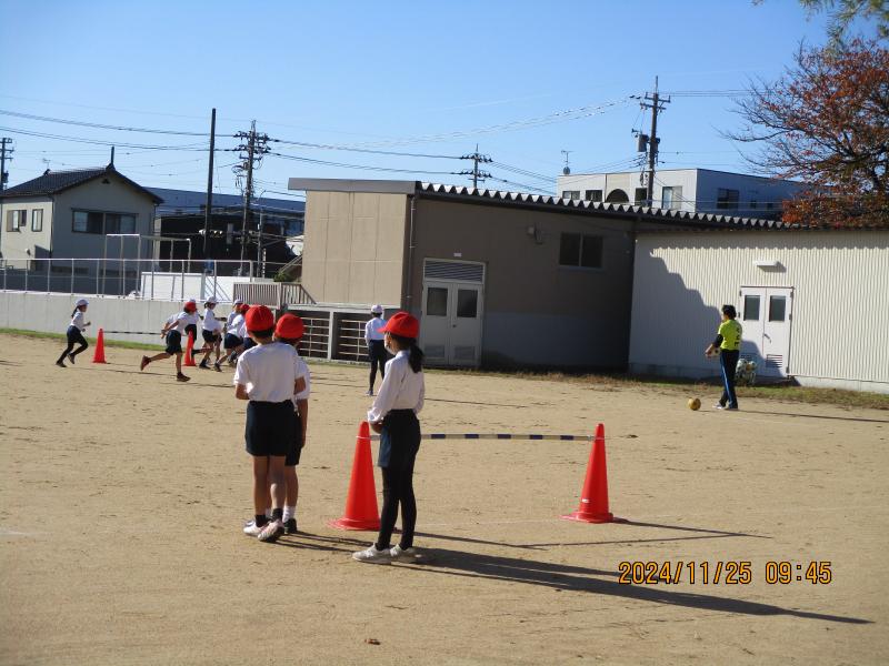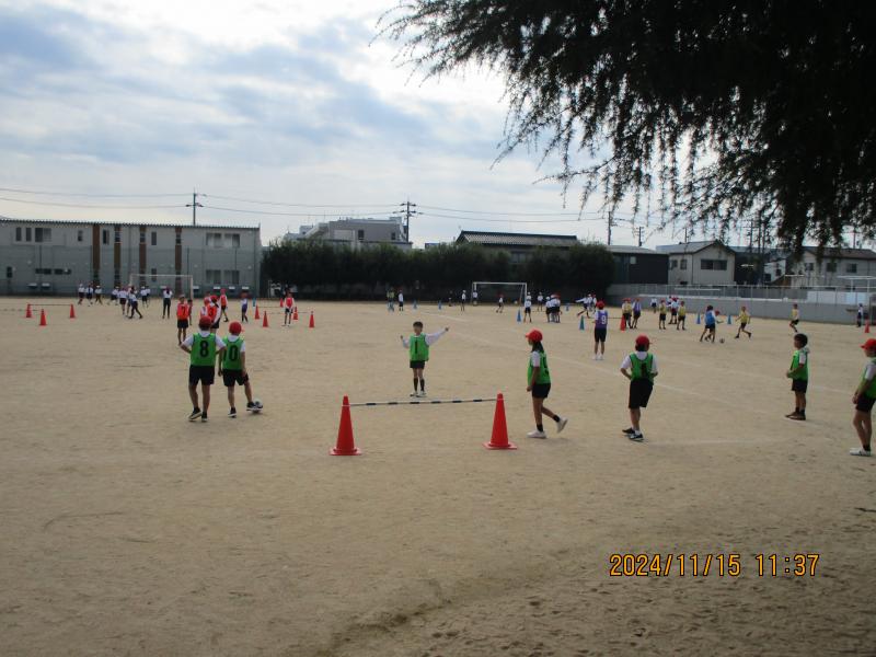 3年生が体育館やグランドで楽しくサッカーをしていました。
