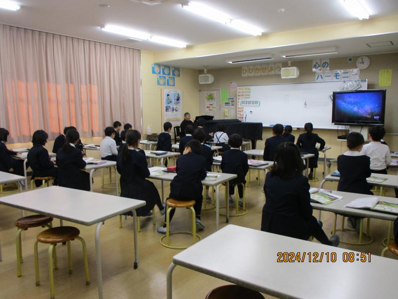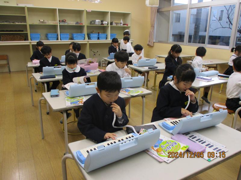 1年3組の音楽です。まだ始まる前から、鍵盤ハーモニカを弾いていました。「聞いて 教科書を見なくても弾けるよ!」と練習に夢中でした。