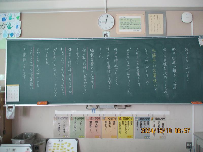 4年1組、継続して毎朝黒板にメッセージを書いています。
