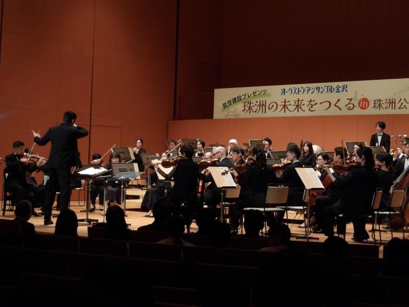 本日、ラポルトすずでオーケストラアンサンブル金沢のコンサートが行われました。舞台上には、音楽の教科書に出てくる弦楽器や管楽器がずらりと並んでおり、始まる前からわくわくした様子の子供達。演奏は、とても迫力があり、生の演奏のすごさを感じることができました。子供達は、聴いたことのある曲に体を揺らしたり、自然と手拍子がうまれたりしていました。プログラムの中には、演奏に合わせて「さんぽ」や「believe」の合唱もありました。珠洲市の小中学生全員で歌う歌は、とても素晴らしかったです!