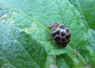先週の昆虫は,ニジュウヤホシテントウでした。このテントウムシは,幼虫も成虫も,ナス科の葉を食べています。この写真では,ジャガイモの葉っぱをかじっています。
