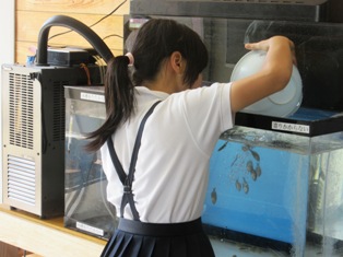 県水産総合センターの四名の職員の方が,90センチ水槽とクーラーをつけていきました。1週間ほどこのまま水を循環させたあと,ある魚が入ります。