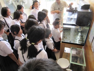 そんなわけで,その様子を見ようと,登校してきたばかりの低学年の子どもたちも,一緒に水槽に群がってきます。ヒラメも可愛いけど,こうやってエサやりを見に来てくれる子どもたちも可愛いですね。