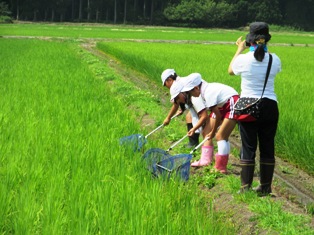 まずは,小さな網を持って池へ行き,水の中でゆったりと網を動かします。何が入っているか見えないんですが,みんな覗いています。その網をペトリ皿に入れた水で洗って,数回。あとは,水草を少しちょん切って,理科室へ。