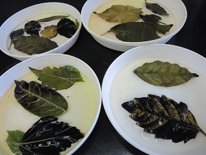今回は,1度目の「たたき出し方」ではなく,エタノールを使った「脱色法」でやってみました(上の写真は,エタノールで脱色している様子)。緑色が抜けた葉っぱの様子に驚き,エタノールがきれいな緑色に染まったのを見て喜んでいました。