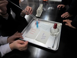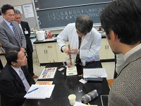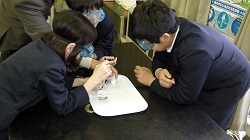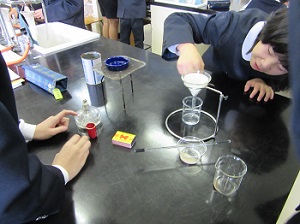 班で相談し実験。においやリトマス反応,蒸発させてみて残った物を見る…などの実験をして,見事同定できました。