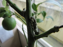 学校の向かいのお家のおばあちゃんから,「レモンの鉢植えに幼虫がいるからどうですか」と声をかけてもらい,頂いてきました。レモンの実もできているのですが,それは,あとでお返しすることにします。
