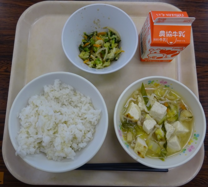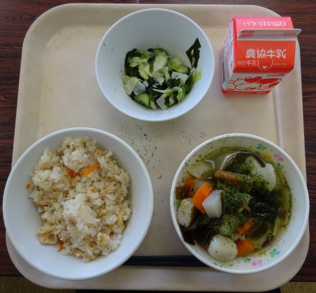 シーチキンごはん、キャベツのしらす和え、静岡おでん風、牛乳