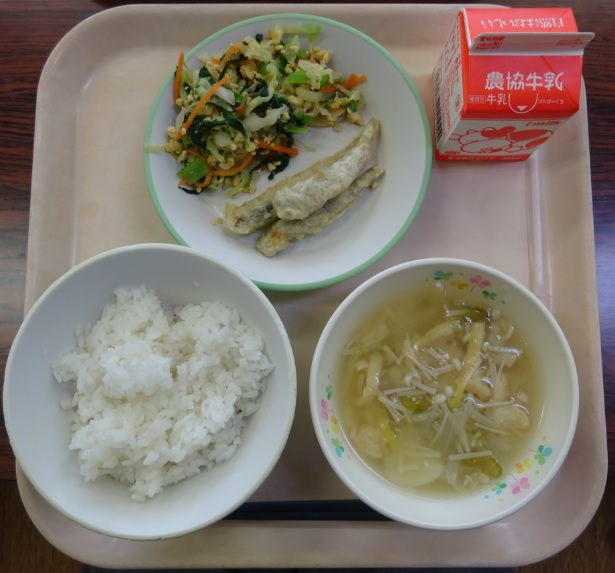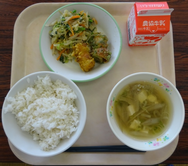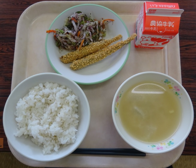 麦ごはん、ちくわの二色揚げ、ごま和え、