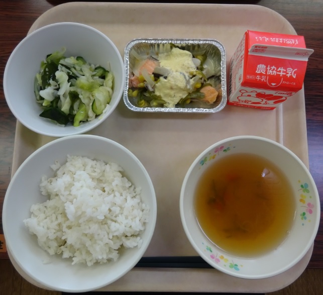 麦ごはん、鮭のマヨネーズ蒸し、きゅうりとかまぼこの酢の物、