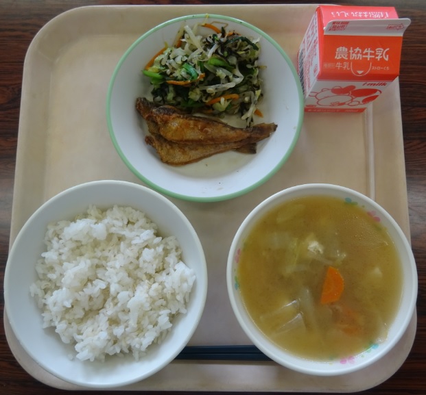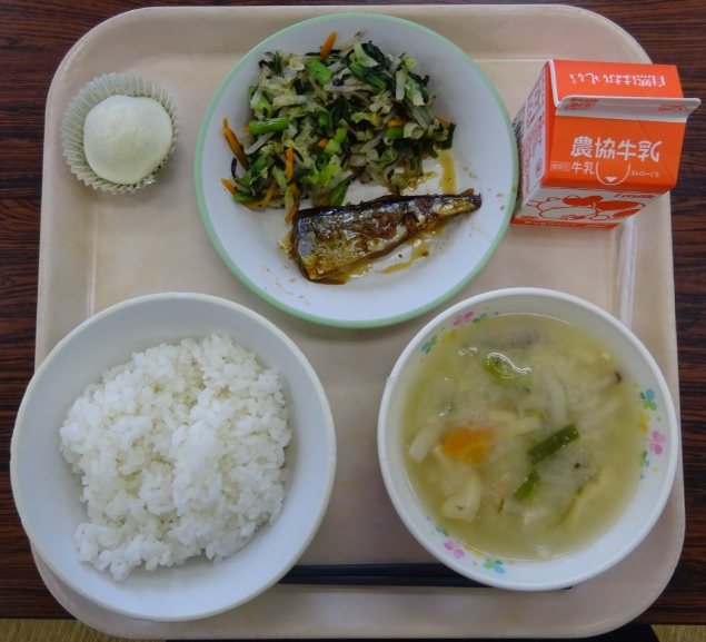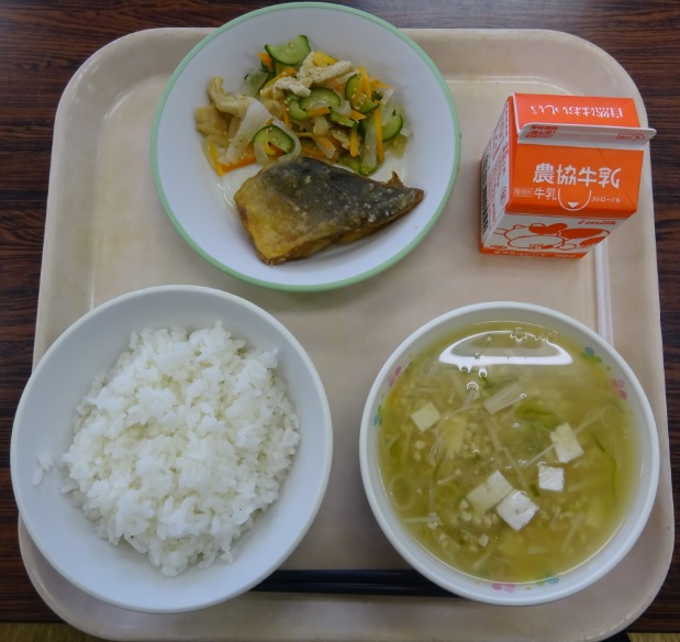 ごはん、さばのピリ辛ダレ、五目きんぴら、かきたま汁、牛乳