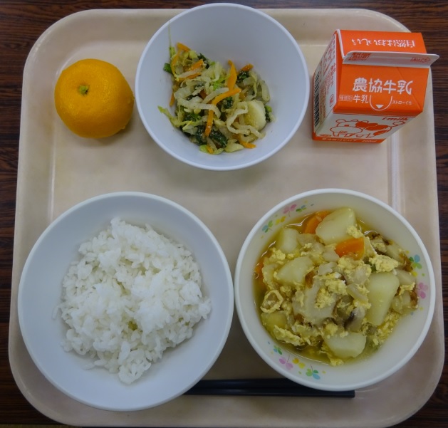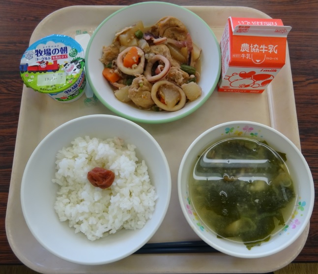 麦ごはん、切干大根の和え物、厚揚げとひき肉のうま煮、牛乳
