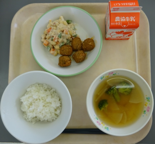 ごはん、ミートボール、ポテトサラダ、コンソメスープ、牛乳