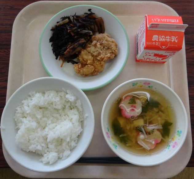 ごはん、鶏肉の唐揚げ甘酢だれ、卯の花の炒り煮、みそ汁、牛乳