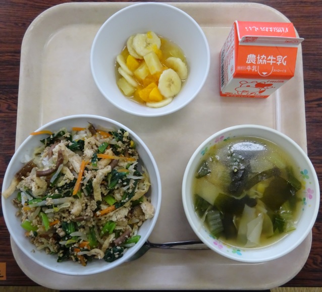 ひじきごはん、千草あえ、みそ汁、牛乳