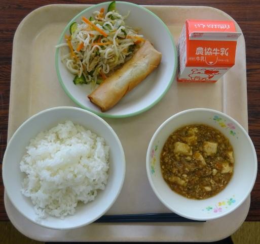 ごはん、春巻き、もやしとかまぼこの中華サラダ、麻婆豆腐、牛乳