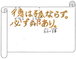 孔子の言葉で、「徳を身につけた人は孤立しない。きっと新しい友達ができる」という意味です。「徳」って難しい言葉ですよね。徳を身につけた人とは、たとえば、思いやりの気持ちのある人、たとえば、信念を持って誠実に生きる人のことだそうです。