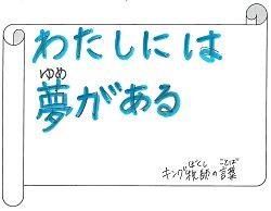 自由で平等な社会を目指し、差別をなくすために粘り強い運動をすすめたキング牧師の言葉です。キング牧師の夢は"誰もが平等に仲良く過ごせる社会になること"。あなたの夢は何ですか?