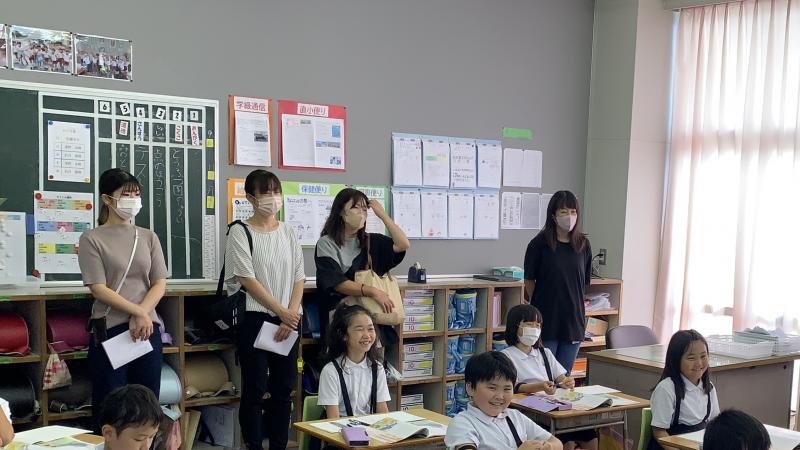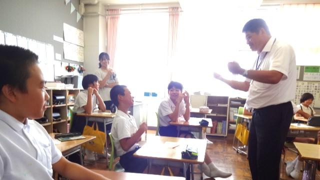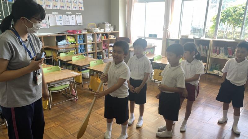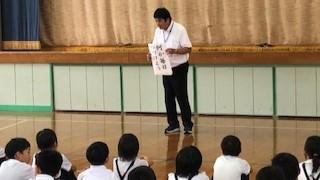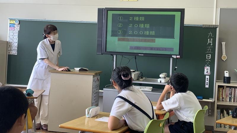 本日、市内他校から栄養教諭の先生が来てくれました。配膳や給食の様子を見ていただきました。本校児童は実に食べっぷりがいいそうです。1年生には、クイズ形式で調理場のことも教えてもらいました。実際に使う大きなしゃもじも持たせてもらって、1年生は大喜びでした。食欲の秋を迎えます。これからもどんどん給食を食べてほしいです。