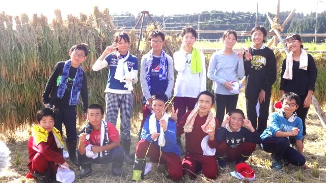 本日、天候にも恵まれ、たわわに実った学校田の稲刈り体験をすることができました。「農事組合法人 きずな」様のご指導、長生会、直公民館様のご協力の下、稲刈りの仕方、縛り方、はざかけを体験しました。下級生たちも応援にきてくれました。刈り取った稲を縛るのに、かなり苦労もしていましたが、どの作業も大変楽しかった」ようです。貴重な体験をさせていただき、お世話いただいた方々に心より感謝申し上げます。