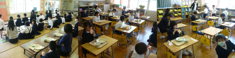 今日から給食が再開されました。[密]をふせぐために、1~3年生は教室で、4~6年生はなかよしルームで食べるようにしました。準備に少し大変さはありますが、6年生が中心となって、テキパキと準備をすすめていました。
