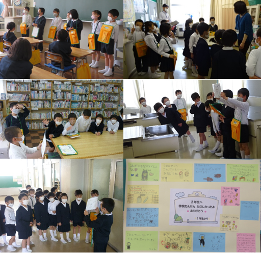 2年生は生活科の学習で1年生に学校を案内しました。教室に関するクイズを作ったり,折り紙のプレゼントを用意したりして準備を進めてきた2年生。1年生に案内するのをとても楽しみにして,「どきどきする~」「楽しみだなぁ」と言っていました。当日は1年生に優しく声をかけながら案内することができ,お兄ちゃん・お姉ちゃんになった姿が見られました。これからも1年生と仲良く活動できるといいなと思います。