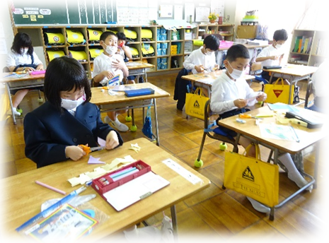 今週の図画工作科「ちょきちょきかざり」では、紙を折ったり重ねたりして、はさみで切る「切り絵」の学習でした。小学校に来て初めてはさみを使ったので、最初はなかなか上手くいかず、涙目になる子も…。