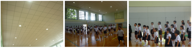 朝、児童の健康を確認した後、大掃除して3週間分の汚れを落とした後、始業式を行いました。体育館工事がほぼ終了し、後はバスケットゴールをつけるのみとなったので、この時間だけ工事の方にお願いし、体育館での始業式となりました。