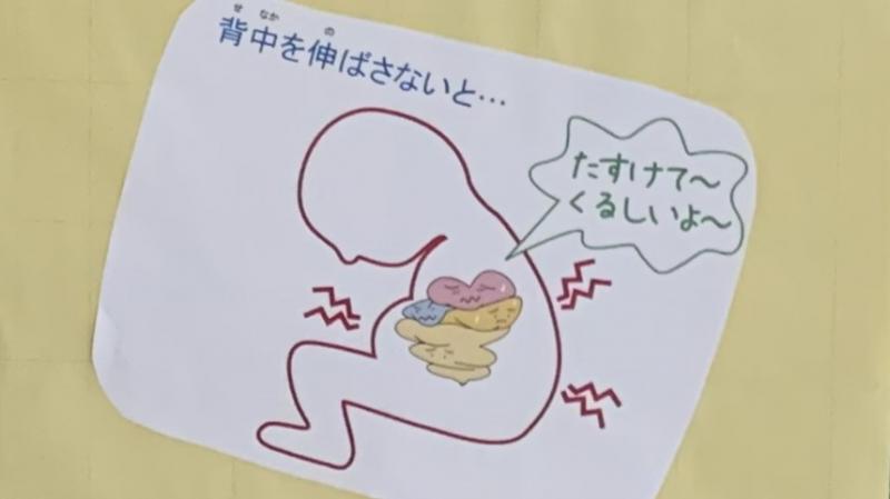 保健室前の掲示板から様々な健康に関する発信をしています。見ていると、結構子ども達は立ち止まって見ています。今回は「背骨曲がっていないかな?」。床に記した足形にあわせて立ってみれば、自分の状態を確かめることが出来ます。授業では、かなり多くの時間、座る姿勢が求められます。健康な発育のために、座る姿勢はとても大切です。日々十分意識してほしいものです。
